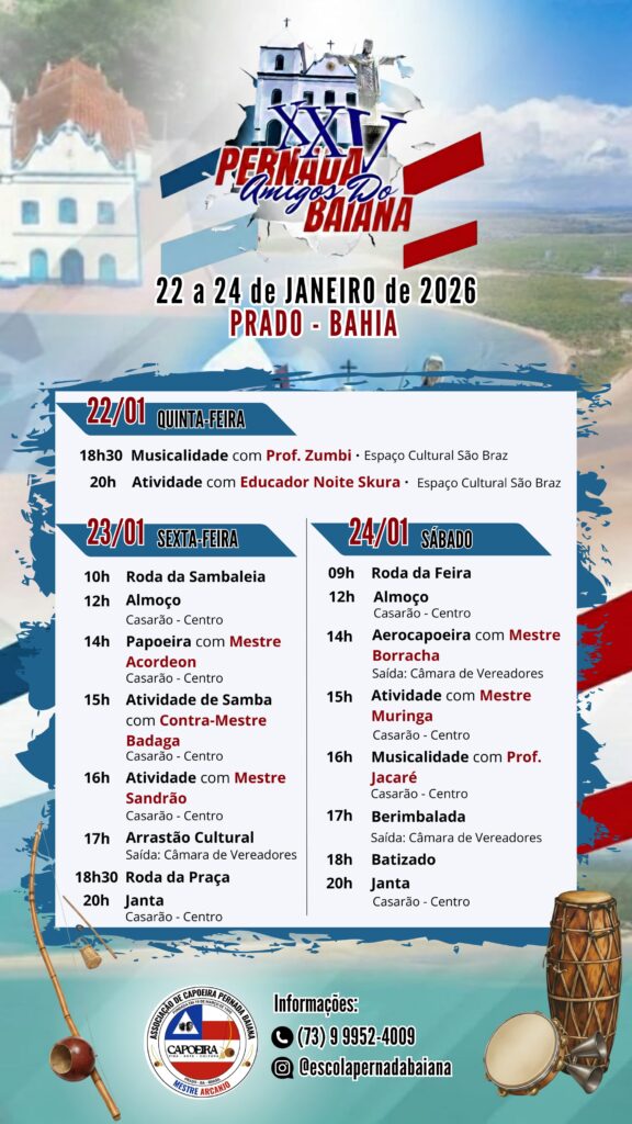 Ao final da entrevista, Arcanjo reforçou o convite à comunidade. “O evento não é só do Pernada Baiana. Mestres, professores, alunos e toda a população estão convidados para participar das oficinas, das rodas na praça, na feira e na sambaleia. Todos são bem-vindos.”